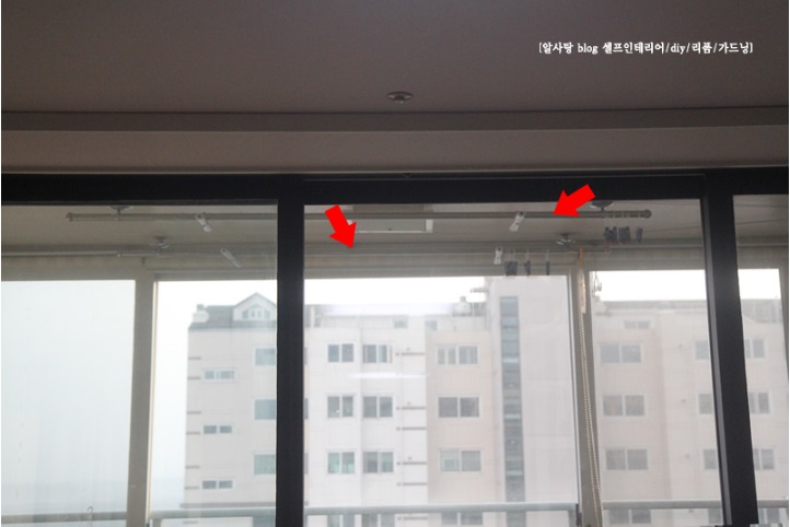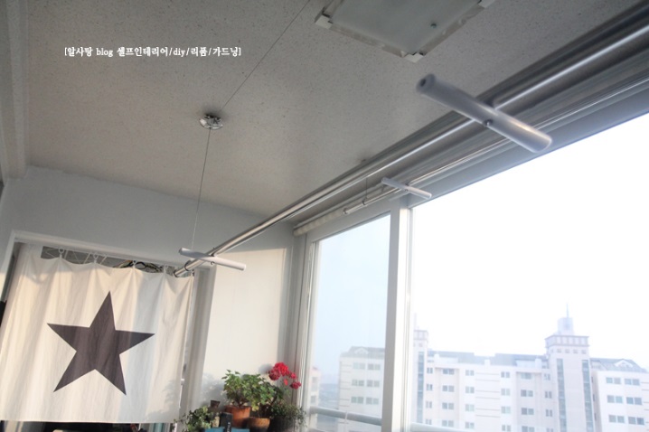 사용하지 않을때 천장에 딱 붙게 끝까지 올려놓으면 많이 보기싫지도 않다고 하시길래 거실 바로 앞 베란다에 설치하기로 했어요.
