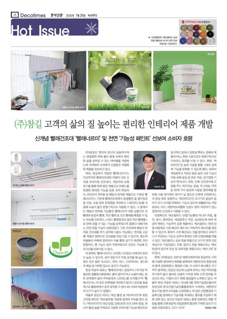 참길, 고객의 삶의 질 높이는 편리한 인테리어제품 개발 (장식신문 제449호) 페이지 정보 작성자 최고관리자 작성일22-07-20 15:39 조회26,250회 댓글0건 관련링크 본문 참길, 고객의 삶의 질 높이는 편리한 인테리어제품 개발 (장식신문 제449호) 댓글목록 등록된 댓글이 없습니다. 이전글 다음글 목록