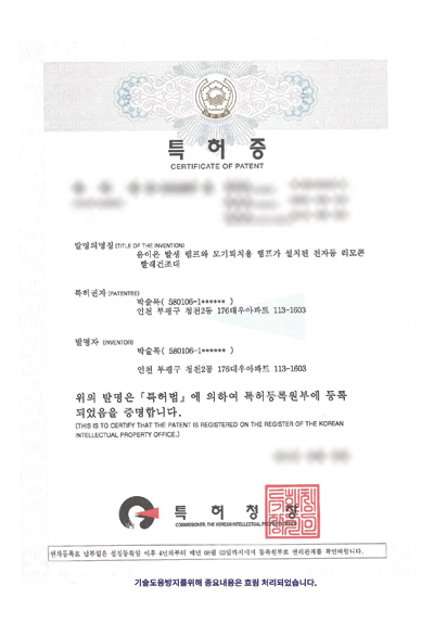 [특허증] 음이온 발생 램프와 모기퇴치용 램프가 설치된 전자동 리모콘 빨래건조대