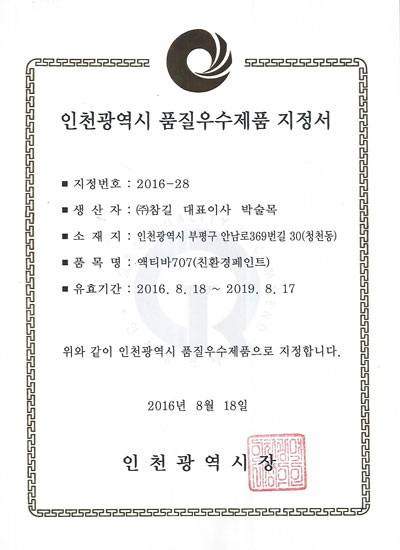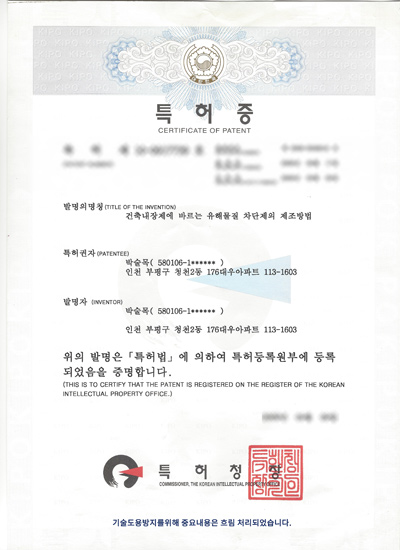 [특허증] 건축내장제에 바르는 유해물질 차단제의 제조방법
