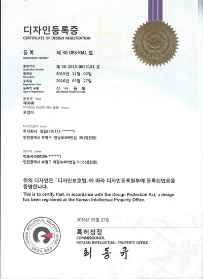 [디자인등록증] 빨래건조대용 와이어 고정장치